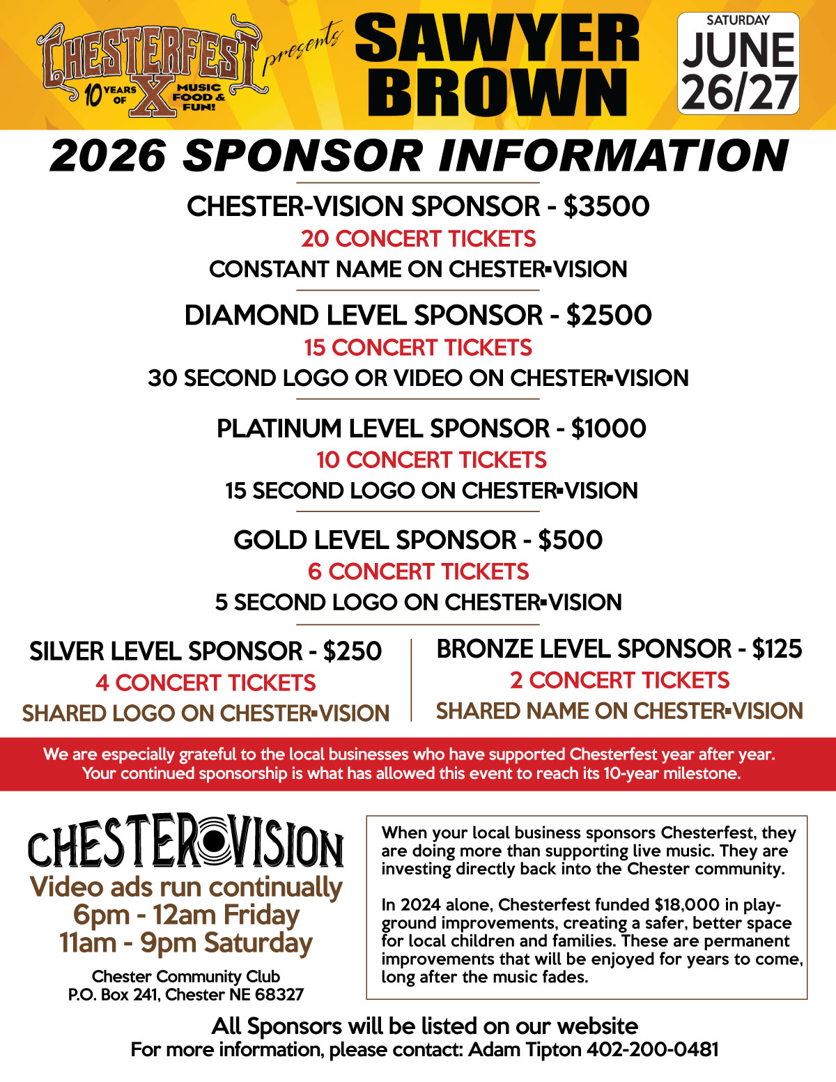 Please note: All sponsors who pay by June 1st will have their names on our stage screens during Chesterfest!